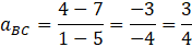 Prosta BC, przechodzi przez punkty B oraz C. Więc jej współczynnik kierunkowy możesz wyliczyć, ze wzoru na współczynnik kierunkowy prostej przechodzącej przez punkty (x1, y1) oraz (x2, y2).
