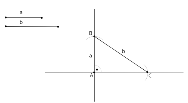 Zacznij od narysowania odcinków a i b oraz dwóch prostych prostopadłych przecinających się w punkcie A. Zmierz za pomocą cyrkla długość odcinka a, a następnie nie zmieniając rozwartości wbij cyrkiel w punkt A i zakreśl łuk na jednej z prostych. Punkt przecięcia łuku i prostej oznacz jako B. Zmierz za pomocą cyrkla długość odcinka b, a następnie nie zmieniając rozwartości wbij cyrkiel w punkt B i zakreśl łuk na drugiej prostej. Punkt przecięcia łuku i prostej oznacz jako C. Po połączeniu punktów A, B i C powstanie szukany trójkąt.