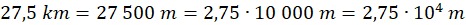 W tym zadaniu zamień 27,5 km na metry, a następnie otrzymaną liczbę przedstaw za pomocą notacji wykładniczej.