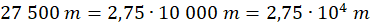 Następnie zapisz 27 500 m w notacji wykładniczej. Notacja wykładnicza to iloczyn liczby równej lub większej od 1 i mniejszej od 10 oraz potęgi liczby 10:
