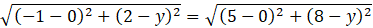 Wiedząc, że A = (-1, 2), B = (5, 8) oraz odległość A i B od niewiadomego punktu na osi y jest taka sama, określ jego współrzędne.