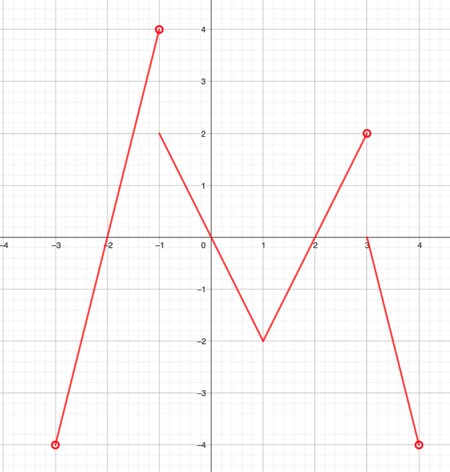 Do dziedziny nie należą argumenty -3, 4 zatem przedział jest otwarty. Funkcja, dla argumentu -1, przyjmuje wartość 2, a nie 4 zatem funkcja nie ma największej wartości. Funkcja nie przyjmuje wartości -3, ponieważ argumenty -3 i 4 nie należą do dziedziny.