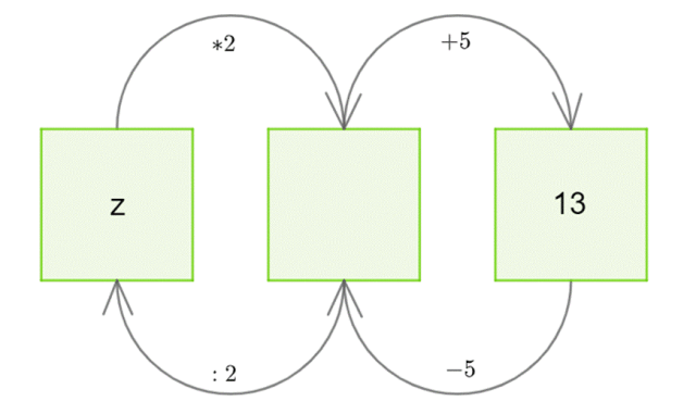 W pierwszym polu (od lewej) musi znaleźć się liczba, na której wykonujemy działania, jest to szukana przez nas wartość. Strzałki na górze prowadzą do wyniku (działania muszą być w pisywane w takiej kolejności, w jakiej są wykonywane), który znajduje się w ostatnim polu grafu – umieść przy strzałkach kolejne działania. Strzałki na dole prowadzą od wyniku do niewiadomej, ponadto zawierają działania odwrotne do tych, które znajdują się nad nimi – teraz dzielenie zastępuje mnożenie, a odejmowanie – dodawanie. Wykonuj po kolei działania na dole (zgodnie ze strzałkami), dojdziesz do szukanej wartości.