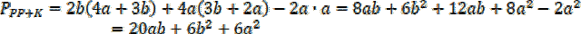 Powierzchnię kuchni oblicz odejmując od prostokąta o wymiarach 4a na (3b + 2a) kawałek łazienki o wymiarach 2a na a