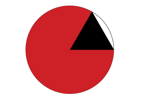 , gdzie α oznacza kąt zakreślony przez dany łuk, natomiast r oznacza promień danego łuku. Wiadomo, że czarny trójkąt to trójkąt równoboczny, zatem jesteś w stanie wyznaczyć jego pole. Wiesz także, że jego kąt przy każdym z wierzchołków ma 60°, zatem wycinek oznaczony kolorem czerwonym zakreśla łuk 300°.