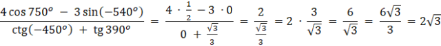 Obliczanie wartości wyrażenia możesz zacząć od wyznaczenia wartości funkcji trygonometrycznych podanych kątów, zapisując je w postaci sumy: pewnej wielokrotności kąta pełnego oraz kąta o mierze mniejszej od 360o. Następnie powinieneś skorzystać z odpowiednich wzorów redukcyjnych: