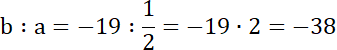 Na początek oblicz wartość liczby a: wykonaj mnożenie i dzielenie (dzielenie przez ułamek zapisz jako mnożenie przez jego odwrotność), a następnie wykonaj odejmowanie otrzymanych wyników, odejmowanie liczby ujemnej możesz zapisać jako dodawanie liczby do niej przeciwnej. Potem wylicz wartość liczby b: wykonaj mnożenie i dzielenie, a następnie wykonaj dodawanie otrzymanych wyników, dodawanie liczby ujemnej możesz zapisać jako odejmowanie liczby do niej przeciwnej. Na koniec podziel wartość liczby b przez liczbę a, czyli pomnóż liczbę –19 przez odwrotność ułamka.