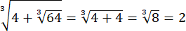 Na początku oblicz pierwiastek znajdujący się pod pierwiastkiem i potęgę. Następnie oblicz sumę liczb i pierwiastek.