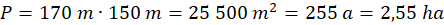 W tym zadaniu ustal, ile wynosi pole prostokąta o wymiarach 170 m x 15 000 cm. Otrzymaną wartość przedstaw za pomocą arów i hektarów.