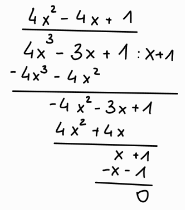 Przekształcasz dane równanie, aby otrzymać wielomian o współczynnikach całkowitych. Zgodnie z twierdzeniem o pierwiastkach całkowitych wielomianu sprawdzasz, które liczby są jego pierwiastkami. Po ustaleniu danej liczby wykonujesz dzielenie pisemne wielomianu. Wynikiem dzielenia jest trójmian kwadratowy, który sprowadzasz do najprostszej postaci korzystając ze wzoru skróconego mnożenia, co umożliwi ustalenie wszystkich pierwiastków wielomianu.
