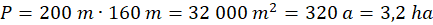 W tym zadaniu ustal, ile wynosi pole prostokąta o wymiarach 200 m x 160 000 mm. Otrzymaną wartość przedstaw za pomocą arów i hektarów.