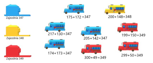 Wykonaj najpierw działania umieszczone na każdym z autobusów, a następnie pokoloruj je odpowiednimi kolorami.