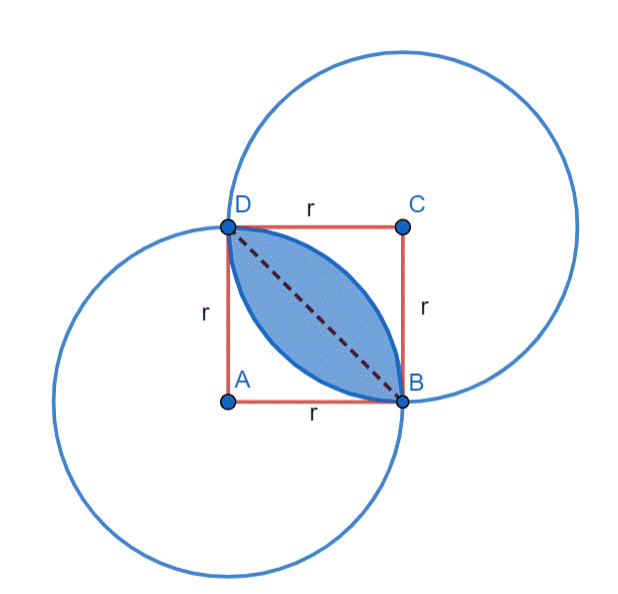 W tym zadaniu musisz obliczyć pole figury, będące częścią wspólną pól okręgów o środach w punktach A i C.