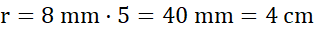 Na początek musisz obliczyć promień zawieszki: podziel jej średnicę przez 2. Następnie przypomnij sobie co oznacza skala 5:1: musisz powiększyć drugie koło 5 razy w porównaniu do pierwszego. Pomnóż promień mniejszego koła przez 5 i zamień milimetry na centymetry.