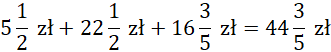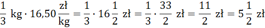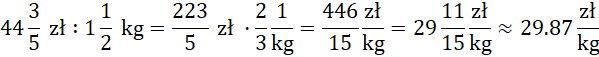 Rozwiązywanie zadania zacznij od obliczenia masy mieszanki, dodaj do siebie masę każdego rodzaju cukierków (licz sprytnie, dodaj do siebie ułamki o takich samych mianownikach, otrzymasz liczbę naturalną, do niej dodaj ostatnie ułamek). Następnie oblicz cenę każdych słodyczy w mieszance: mnóż masę słodyczy przez ich cenę (zamień cenę na ułamek niewłaściwy, bo niektóre z ułamków zwykłych mają nieskończone rozwinięcia dziesiętne). W kolejnym kroku dodaj do siebie otrzymane ceny – tyle kosztuje 1,5 kilograma cukierków, czyli jeden kilogram jest 1,5 razy tańszy, wykonaj dzielenie. Możesz podać cenę w złotówkach, do tego celu zaokrąglij wynik do drugiego miejsca po przecinku (1 złotówka ma 100 groszy).