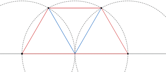 Zastanów się, skoro kąt ostry ma 60 stopni, to kąt rozwarty musi mieć miarę 180 – 60 = 120 stopni. Możemy poprowadzić odcinek, który podzieli kąt rozwarty na pół i zetknie się z najdłuższym odcinkiem dokładnie w jego połowie (ponieważ trapez jest równoramienny, z drugiej strony powstanie identyczny odcinek o takich samych własnościach). Zauważ, znamy dwa kąty tego trójkąta – 60 stopni utworzone przez ramię i dłuższą podstawę trapezu oraz 60 stopni z połowy kąta rozwartego, a ponadto wiemy, że jeden z boków trójkąta wynosi tyle, co długość ramienia. Możemy z tych informacji wyciągnąć wnioski: trzeci kąt także ma 60 stopni (180 – 60 – 60 = 60), a pozostałe dwa boki też muszą mieć długość ramienia trapezu, bo jest to trójkąt równoboczny. Mamy już dwa trójkąty równoboczne, na środku powstał identyczny, gdyż ma on trzy boki długości równej ramieniowy i po 60 stopni pomiędzy nimi. Tworząc Konstrukcję, zbuduj trójkąt równoboczny, do niego skonstruuj kolejny, identyczny trójkąt, a do niego – jeszcze jeden taki sam trójkąt.