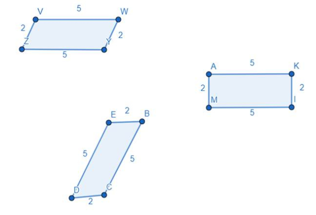 Narysuj 3 niejednakowe równoległoboki, którego boki będą wynosić 2 cm i 5 cm