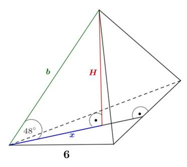 wysokości trójkąta równobocznego znajdującego się w podstawie. Następnie wysokość ostrosłupa (H) i krawędź boczną (b) oblicz, stosując zależności trygonometryczne w trójkącie prostokątnym.