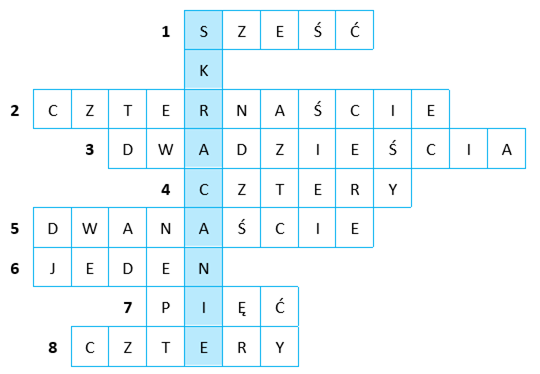 Rozwiąż krzyżówkę, wpisując słownie brakujące liczniki bądź mianowniki podanych ułamków.
