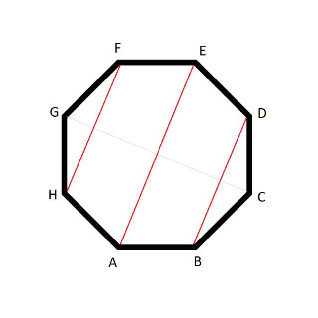 W tym zadaniu musisz zaznaczyć wszystkie odcinki o końcach w punktach A, B, C, D, E, F, G, H, jeśli ich symetralną jest prosta CG. Ponadto wypisz kąty, dla których półprosta GC jest dwusieczną.