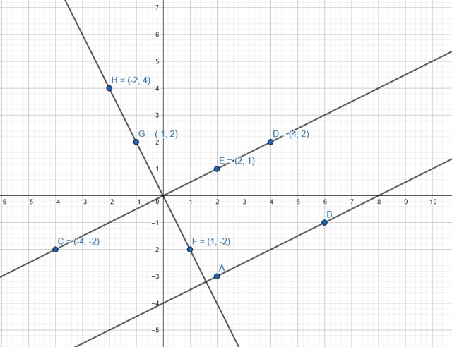 W układzie zaznacz punkty A i B oraz narysuj prostą przechodzącą przez te punkty. Następnie narysuj prostą m równoległą do AB oraz prostą k prostopadłą do AB. Następnie na obu prostych zaznacz po trzy punkty i odczytaj ich współrzędne.