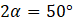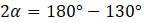 Kąt pomiędzy ramionami ma 130°. Suma miar kątów w trójkącie jest równa 180°, więc aby obliczyć pozostałe kąty Rozwiąż równanie.