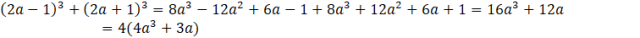 Dwie kolejne liczby całkowite możesz zapisać jako 2a – 1, 2a + 1, gdzie a jest liczbą całkowitą. Zapisz sumę sześcianów tych liczb. Następnie skorzystaj ze wzorów skróconego mnożenia na sześcian różnicy i sześcian sumy. Zredukuj jednomiany podobne. Wyłącz przed nawias czynnik równy 4, otrzymując w ten sposób iloczyn 4 i liczby całkowitej.
