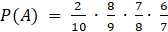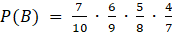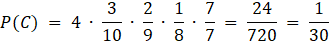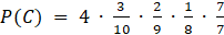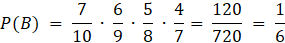 Aby zaszło zdarzenie A, potrzebujesz następujących losowań – piłeczka zielona, piłeczka niezielona, piłeczka niezielona, piłeczka niezielona. Wymnóż prawdopodobieństwa tych zdarzeń, pamiętając, że losujesz bez zwracania. Aby zaszło zdarzenie B, potrzebujesz następujących piłek: biała lub zielona, biała lub zielona, biała lub zielona, biała lub zielona. Tutaj również ilość piłeczek zmniejsza się z każdym losowaniem. Aby zaszło zdarzenie C, musisz wylosować piłeczki: pomarańczowa, pomarańczowa, pomarańczowa i dowolna, w dowolnej z 4 kolejności. Otrzymasz więc