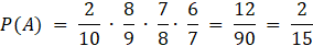 W tym zadaniu musisz, korzystając z drzewa, obliczyć prawdopodobieństwo zdarzeń: A – tylko pierwsza wylosowana piłeczka była zielona, B – wszystkie wylosowane piłeczki były w kolorze białym lub zielonym, C – trzy wylosowane piłeczki były pomarańczowe, jeśli w worku znajdują się piłeczki pingpongowe – 2 zielone, 3 pomarańczowe i 5 białych i losujemy bez zwracania 4 piłeczki.