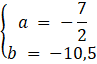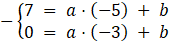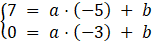 , zatem podstawiamy współrzędne punktów do równania prostej i zapisujemy układ równań, który rozwiązujemy, aby obliczyć współczynniki a i b tej prostej: