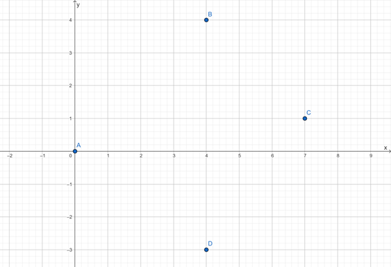 Określ kolejność łączenia punktów A(0,0), B(4,4), C(7,1), D(4,-3) zaczynając od A, aby łamana otwarta była najdłuższa.