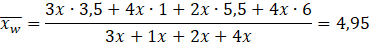 Oblicz średnią (ważoną) cenę pączka, wiedząc, że ceny czterech ich rodzajów wynoszą 3,50 zł, 4,00 zł, 5,50 zł i 6,00 zł, a liczby rodzajów tych pączków w tej kolejności są w proporcji 3: 1: 2: 4.