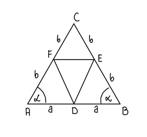 W tym zadaniu udowodnij, że trójkąt, którego wierzchołkami są środki boków trójkąta równoramiennego, też jest równoramienny.