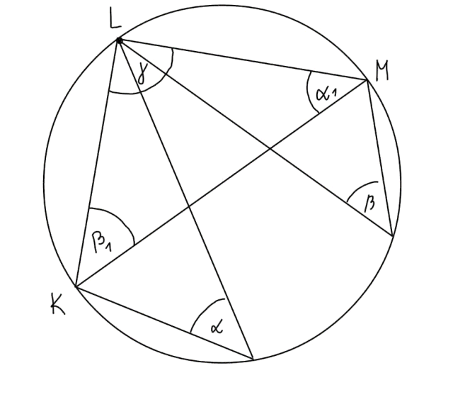 W tym zadaniu uzasadnij, że odcinek KM jest średnicą okręgu, wiedząc, że kąt α ma miarę 54°, a kąt β ma 36°.