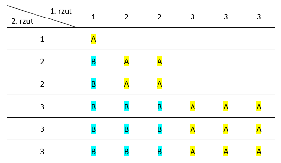 B – przy drugim rzucie wyrzucono większą ilość oczek jak za pierwszym razem