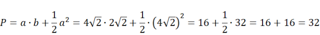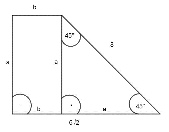 Na początku zauważ, że dany trapez prostokątny można podzielić na trójkąt prostokątny i prostokąt. Trójkąt prostokątny jest trójkątem równoramiennym i jednocześnie połową kwadratu. Długość boku „a” oblicz korzystając ze wzoru na długość przekątnej w kwadracie (Długość przekątnej kwadratu o boku