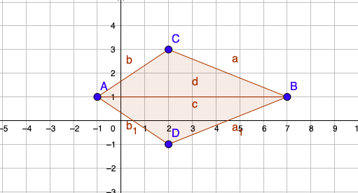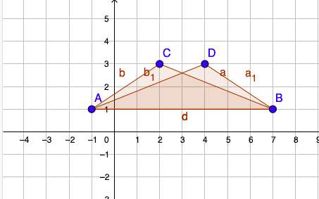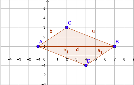 Podaj współrzędne takiego punktu D, aby trójkąty ABC oraz ABD były przystające, kiedy współrzędne wierzchołków trójkąta ABC są: