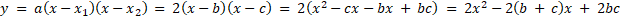 Znając miejsca zerowe funkcji, określamy jej postać iloczynową, którą przekształcamy na postać ogólną. Następnie przyrównujemy odpowiadające sobie współczynniki, tworząc układ równań, z których wyznaczamy współczynniki b i c, pamiętając o założeniach.