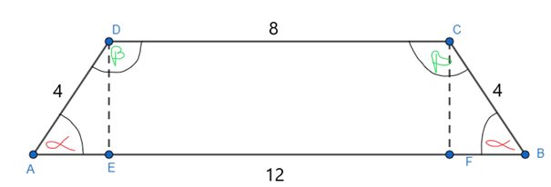 W tym zadaniu należy obliczyć miary kątów trapezu równoramiennego, którego jedna podstawa ma długość 12 cm, druga podstawa ma długość 8 cm, a długość jednego z ramion wynosi 4 cm.