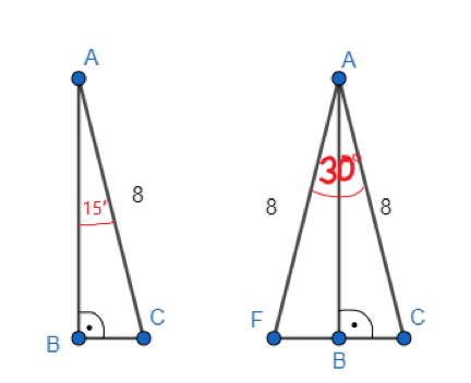 Oblicz pole trójkąta prostokątnego, którego jedna z przyprostokątnych ma miarę 8, a jeden z kątów ostrych ma miarę 15°.