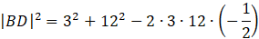 Wróć do równania z twierdzeniem cosinusów, podstaw znane wartość i wyznacz długość odcinka BD.
