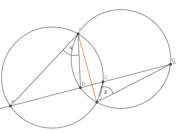 W tym zadaniu musisz udowodnić, iż kąt APB jest równy CQD. Weź pod uwagę, iż dwa okręgi przecinające się w punktach P i Q, a prosta przecina te okręgi w punktach A, B, C, D.