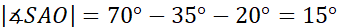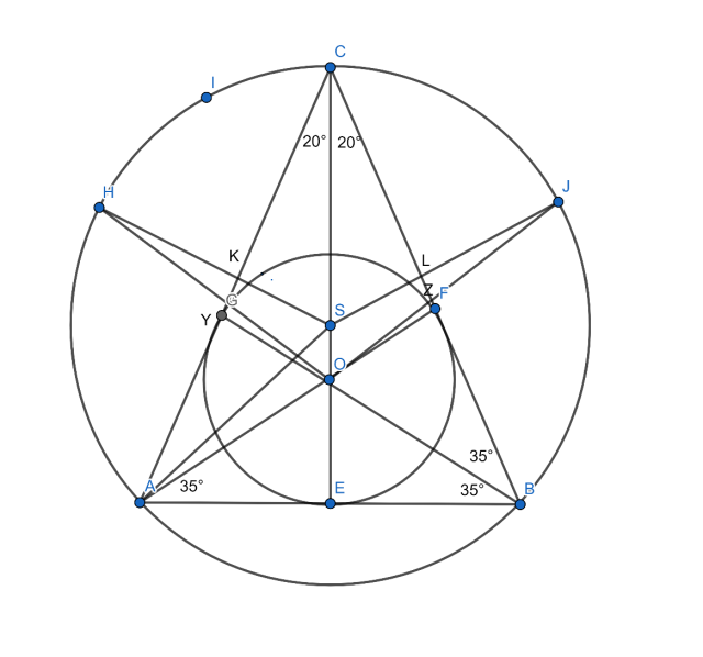 W tym zadaniu oblicz miarę kąta SAO wiedząc, że kąt między ramionami AC i BC trójkąta równoramiennego ABC ma miarę 40°. Punkt O jest środkiem okręgu wpisanego w trójkąt ABC, a punkt S jest środkiem okręgu opisanego na tym trójkącie.