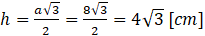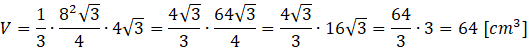 Wyznacz objętość ostrosłupa prawidłowego trójkątnego, którego krawędź podstawy ma długość 8 cm, a wysokość tego ostrosłupa jest równa wysokości jego podstawy.