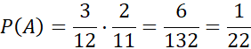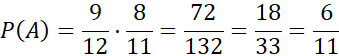 Zwróć uwagę, że wszystkich możliwych zdarzeń jest 12: 9 jaj od kur z wolnego wybiegu + 3 od kur z chowu ściółkowego. Z definicji prawdopodobieństwa wynika, że w liczniku jest liczba zdarzeń sprzyjających, a w mianowniku wszystkich możliwych. Pamiętaj, że losujemy dwa jaja, więc przy wyborze drugiego liczba jajek zmniejsza się o jedną sztukę.