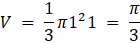 Dany jest stożek o przekroju osiowym w postaci trójkąta prostokątnego. Wysokość stożka wynosi 1. Oblicz jego pole boczne i objętość.