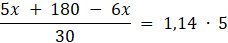 Niech ilość osób w pierwszym zespole będzie oznaczona jako x, wtedy w drugim zespole będzie 30 – x. Ilość wszystkich ryb złowionych przez pierwszy zespól to 5x, a przez drugi – to 180 – 6x. Zgodnie z warunkami zadania można zapisać równość: