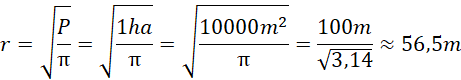 1ha=10 000 m2. Na tej podstawie oblicz promień jako pierwiastek z ilorazu pola i liczby PI.