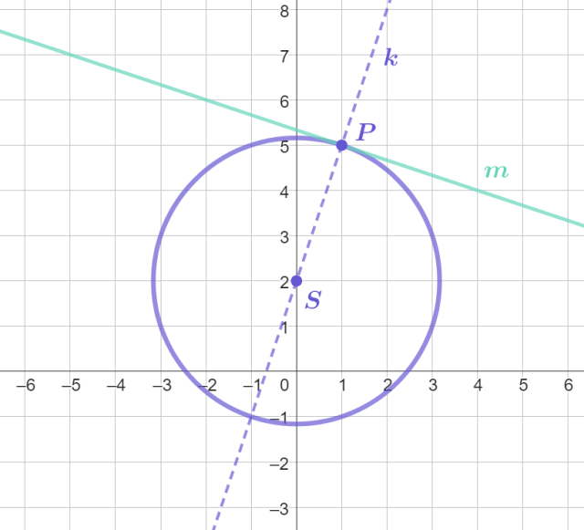 Stwórz rysunek pomocniczy i wprowadź odpowiednie oznaczenia. Wyznacz równanie prostej przechodzącej przez punkt P i środek okręgu. Oznacz ją np. jako k. W tym celu wstaw współrzędne tych punktów do wyrażenia: y = ax + b i wyznacz tym samym współczynniki a i b.