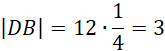 W tym zadaniu musisz obliczyć długość ED. Rozwiąż trójkąt ABD, jeżeli w trójkącie równoramiennym o boku 12 na boku CB obrano taki punkt D, że 3|DB|=|CD| (rysunek obok).